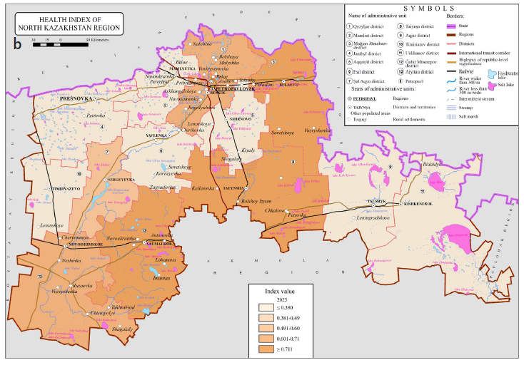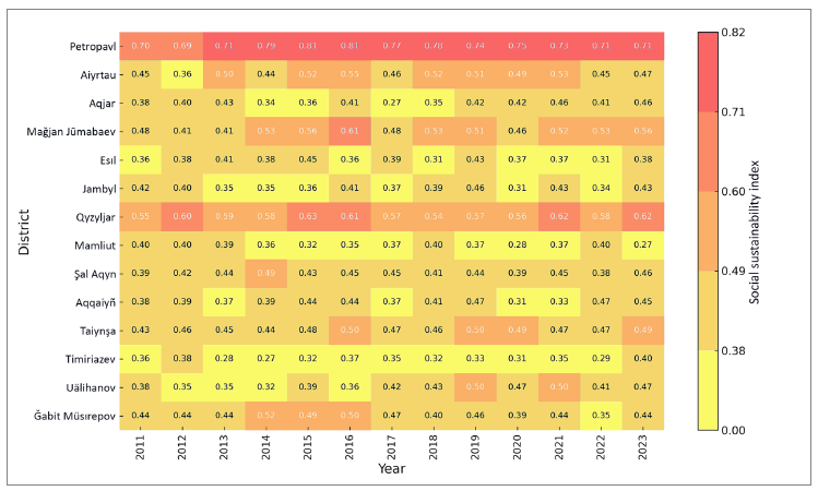 Between 2011 and 2023, the composite social sustainability index of the North Kazakhstan Region had a complex and uneven trajectory. The initial years of the study period were characterized by relatively low index values across most districts, primarily due to a combination of demographic decline, infrastructure deficits, and economic constraints. However, from the mid-2010s onward, a gradual upward trend in social sustainability scores became evident. This improvement is associated with the implementation of social sector modernization programmes, enhanced access to healthcare and education services, and a degree of stabilization in infrastructure development. The pace of this growth, however, was tempered by ongoing demographic pressure: population loss driven by both natural decline and out-migration remained a persistent structural constraint (UNDP Kazakhstan, 2020). By 2017–2019, index values across districts began to converge, indicating that several territories had reached a relative plateau of sustainability. During this period, further positive changes slowed, and inter-district differentiation stabilized. The COVID-19 pandemic, which peaked in 2020–2021, introduced short-term disruptions to the established dynamics. A decline in index values was observed, primarily due to deteriorating health indicators (increased mortality and a greater burden on healthcare systems) and a temporary reduction in quality of life (World Bank, 2021). Nevertheless, by 2022, conditions had partially stabilized, and key sub-indexes returned to pre-pandemic levels. Despite this recovery, the overall demographic situation continued to worsen, thereby constraining the full rebound of the composite index.