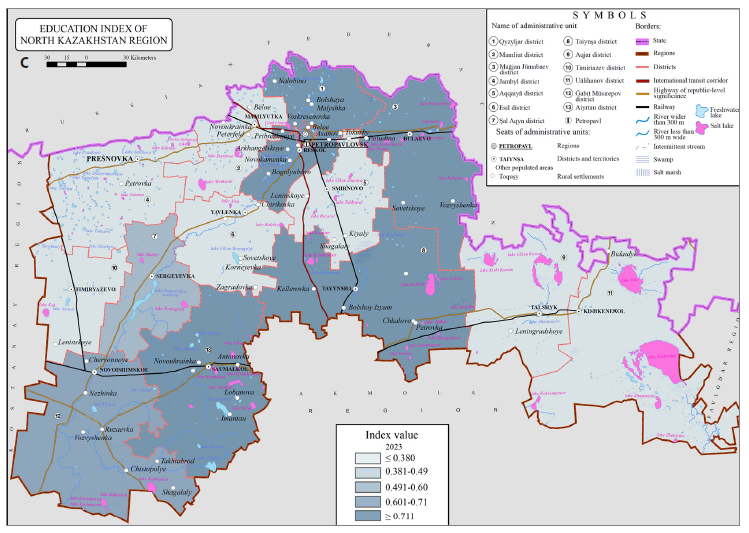 A medium level of social sustainability was recorded in the Taiynşa, Aiyrtau, Jambyl, and Mamliut districts. These territories are characterized by balanced performance across all components, without notable achievements or severe deficiencies. Their sub-index values fluctuate near the regional average, reflecting a relatively stable, though unspectacular, sociodemographic profile. The below-average group includes the Aqqaiyñ district and Mağjan Jūmabaev district. These areas are constrained by relatively weak demographic indicators, limited access to quality healthcare, and insufficient basic infrastructure. The accumulation of social challenges in these districts has resulted in lower composite index values (Institute of Economic Research, 2021). The low sustainability group comprises the districts of Aqjar, Uälihanov, and Şal Aqyn. These remote and sparsely populated rural areas exhibit critically low values across all components. Their profile is shaped by infrastructure isolation, demographic decline, and limited employment opportunities – factors that collectively contribute to chronic social vulnerability. Access to education, healthcare, and essential living conditions in these districts remains significantly below the regional average.