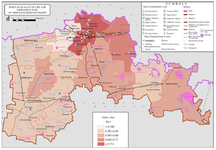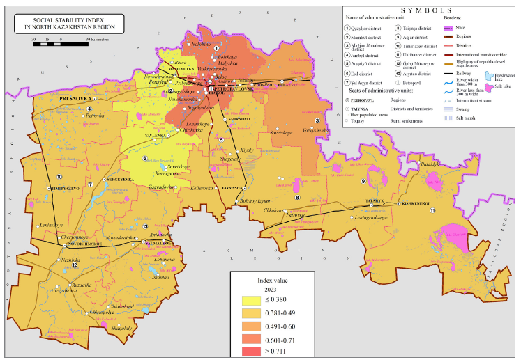 By the end of 2023, all thirteen districts and the city of Petropavl were grouped into five categories based on their social sustainability levels, derived from the composite index. These categories reveal clusters of territories with similar profiles across key sub-indices: demography, healthcare, education, quality of life, and social integration. A high level of social sustainability was recorded only in Petropavl, which outperformed all districts across major components. This is linked to the city’s concentration of socioeconomic resources, strong institutional capacity, and developed infrastructure. High access to healthcare and education, reliable gas and water systems, and comparatively low poverty and unemployment contribute to its comprehensive and resilient sustainability profile.