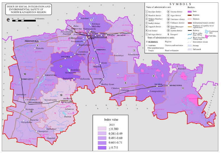 At the international level, significant progress has been made in formalizing composite index systems. Geniaux et al. (2009) classify sustainable development indicator systems based on degree of aggregation, spatial coverage, and analytical purpose. Their classification is useful for comparing approaches used in Kazakhstan. Lacmanović and Tijanić (2025) explore the progress of social policy in the EU by applying the Social Progress Index (SPI), and Wang and Chen (2022) apply principal component analysis to assess social sustainability, demonstrating its effectiveness in reducing multidimensional data. The annual report of the Social Progress Imperative (2025) offers updated data and methodologies for assessing social progress, focusing on rights, health, and opportunities. The World Social Report by the United Nations (2025) provides a framework for assessing social sustainability through the lenses of equity and solidarity. The Sustainable Development Report by SDSN (2024) justifies the metrics for achieving the SDGs and provides a foundation for constructing comparable subnational indices. Examples of regional differentiation in social sustainability highlight the potential for using GIS and remote sensing technologies.