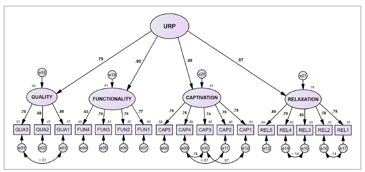 The initial twenty-five–item CFA showed acceptable model fit (χ² = 1014.114, df = 241, χ²/df = 4.208, CFI = 0.951, SRMR = 0.034; RMSEA = 0.057). Based on modification indices and theoretical considerations, eight items were removed due to weak factor loadings (< 0.50), high cross-loadings, or content redundancy. For example, multiple items addressing visual variety were consolidated to eliminate overlap, and items with double-barrelled phrasing were deleted to improve clarity. This yielded a seventeen-item solution comprising three quality items, four functionality items, five captivation items, and five relaxation items. All retained indicators loaded strongly on their intended latent factors (0.630–0.878; all p < 0.001). The four first-order factors were substantially intercorrelated, supporting the presence of a higher-order construct representing the URP (Figure 3). The RMSEA close-fit test was non-significant (PClose = 0.984), indicating close fit (RMSEA ≤ 0.05).