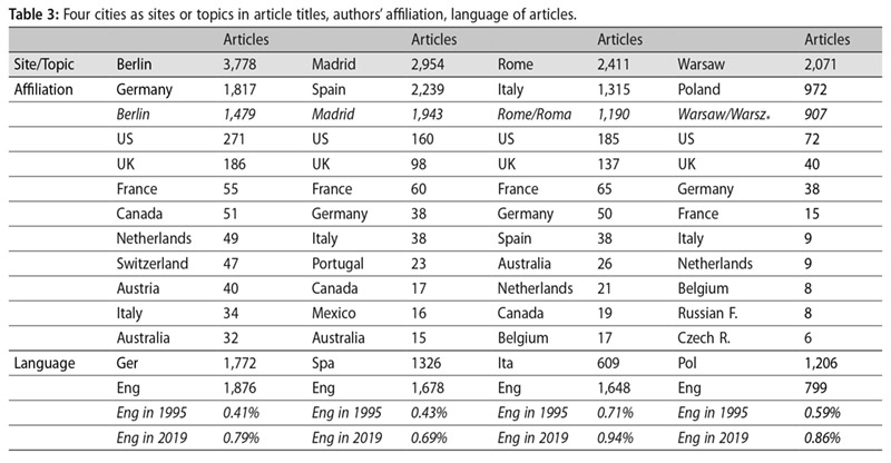 In research articles, cities usually occur as topics (e.g., subjects or actors) or places of studies (e.g., sites, destinations, locations, or spaces). Investigation of more general patterns is rare because research usually focuses on individual cities. We use science mapping, based on Scopus data and Vosviewer visualization software, to examine city-related research across journals and disciplines (subject areas), and to assess how multiple city functions are reflected in journals. Comparable European Union capital cities (Berlin, Madrid, Rome, and Warsaw) serve as models. The patterns are remarkably similar regardless of the city. National and regional journals are the most common publication venues. Research takes place within three major disciplinary clusters: 1) the social sciences, and arts and humanities, 2) medicine, and 3) natural/technical sciences (environmental, earth and planetary, agricultural, and biological sciences). Medicine shows an early prevalence, and recently the social sciences have been strongly represented in these studies. Although the relationships are based on different journals, they are comparable for all cities and can be used to assess cities of similar size. This study was conducted just before the Covid-19 pandemic, and it can serve as a reference to identify research patterns before and after because the outbreak may bring about changes in future city-related research.