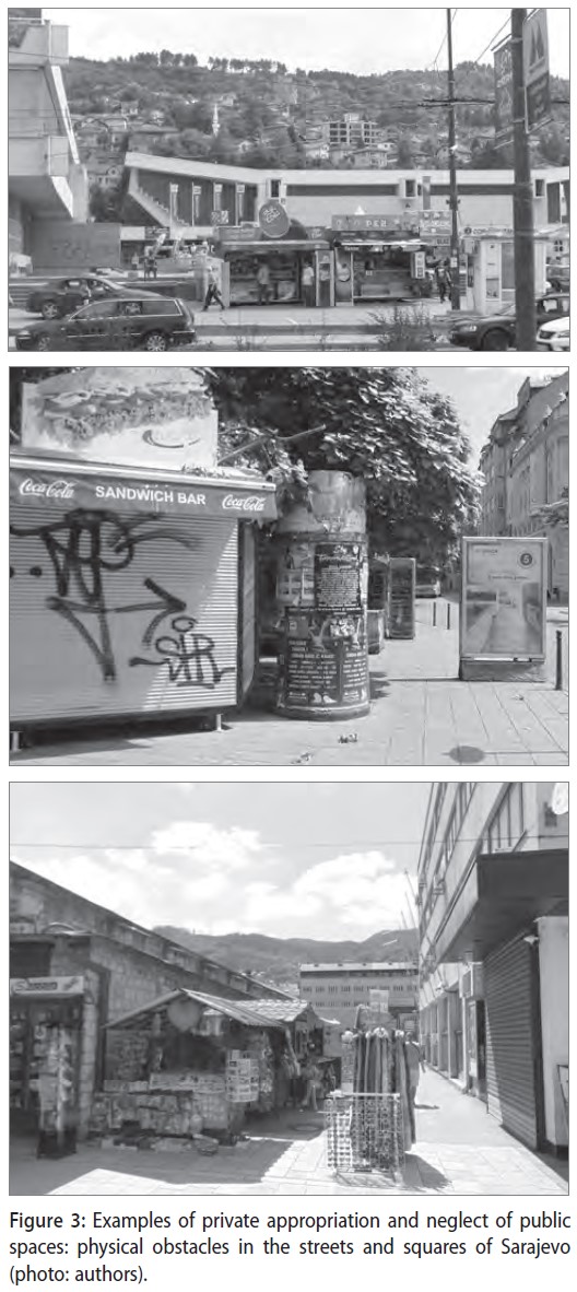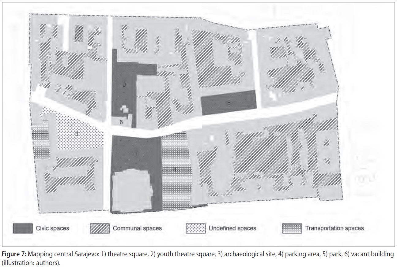 Multiple socio-political and economic factors have gradually led to widespread neglect, decline, misuse, and loss of public spaces in Sarajevo. The clash between private and public interests has left physical traces in the city, recalling the importance of Lefebvre’s notion of the right to the city. In the context of the contemporary urban development of Sarajevo, this is translated into the right to shape, use, recycle, and reactivate the city’s neglected shared spaces. As implied by the title of this article, the key question addressed is to whom public space really belongs. This research proceeds from the identification of the key issues of degradation of public spaces, followed by