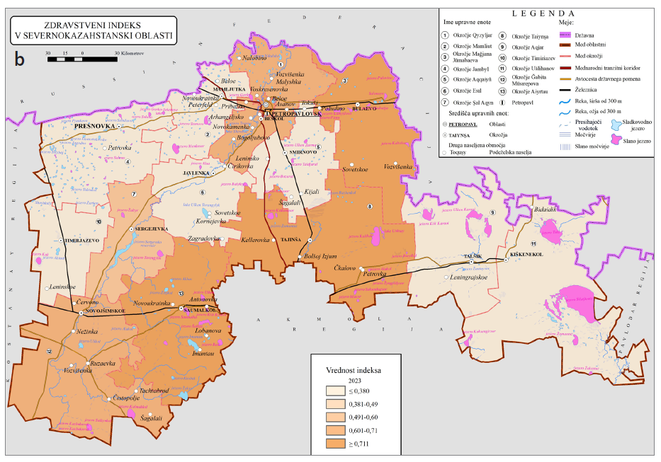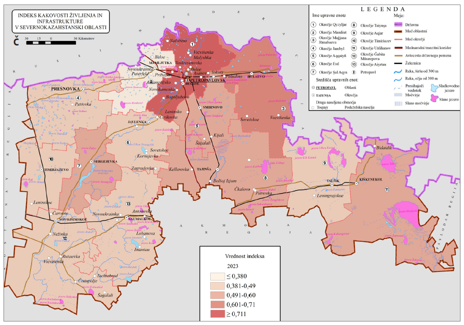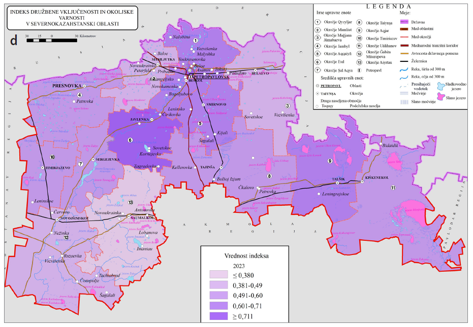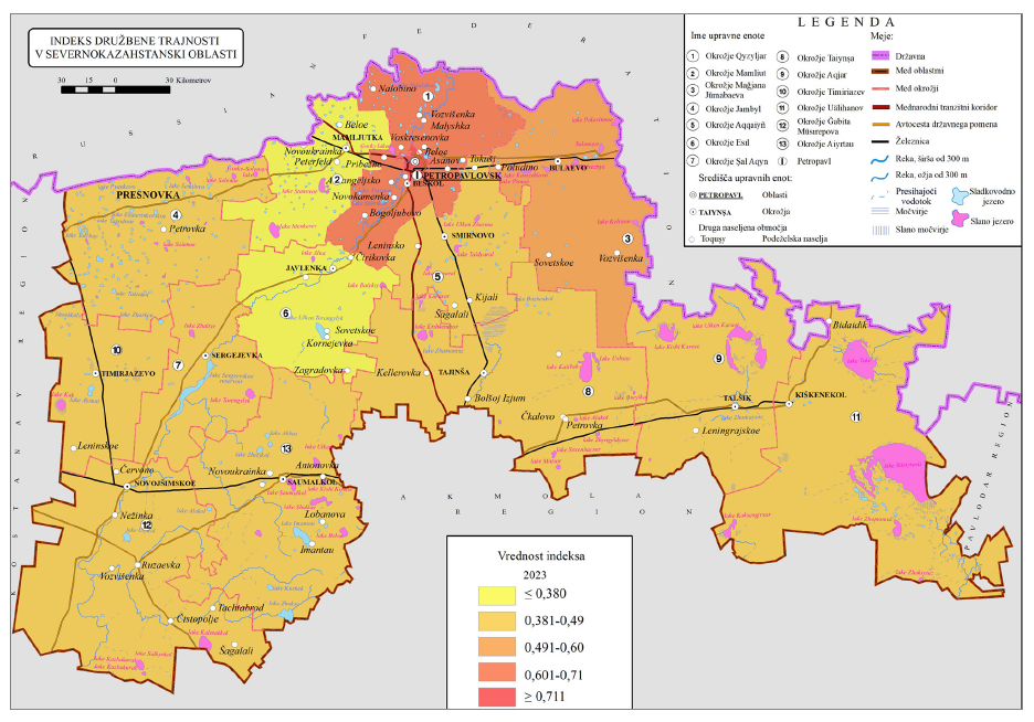 Zaradi čedalje večjih prostorskih razlik se v Kazahstanu veča potreba po sistematični analizi družbene trajnosti na subregionalni ravni. V članku je na podlagi 15 kazalnikov, razvrščenih v pet ključnih komponent (demografija, zdravstvo, izobraževanje, kakovost življenja in družbena vključenost), oblikovan in preizkušen sestavljeni indeks družbene trajnosti. Uporabljena metodologija vključuje normalizacijo podatkov, združevanje kazalnikov in prostorsko analizo z orodji GIS. Analiza je pokazala stabilno, a izrazito nesimetrično prostorsko zgradbo družbene trajnosti: za regionalno središče Petropavl so bile ugotovljene razmeroma visoke vrednosti večine komponent, za večino podeželskih območij pa so značilni odseljevanje, socialna ranljivost ter slab dostop do osnovnih storitev in infrastrukture. Analiza občutljivosti je potrdila uporabnost predstavljenega modela v primerih nepopolnega statističnega poročanja. Na podlagi izsledkov so avtorji oblikovali tipologijo okrožij in predlagali usmeritve za prostorsko usmerjeno socialno politiko. Predlagana metodologija se lahko uporablja za spremljanje razlik med regijami, oceno socialnih tveganj in utemeljevanje trajnostnih razvojnih prednostnih nalog v regijah s spreminjajočo se demografsko strukturo.