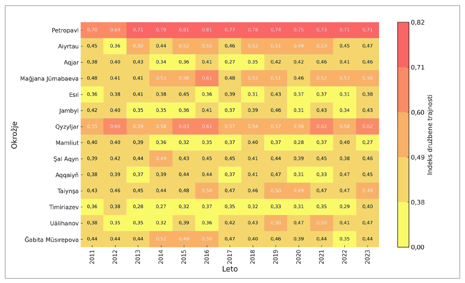 Med letoma 2011 in 2023 je bila dinamika vrednosti sestavljenega indeksa družbene trajnosti zapletena in spremenljiva. V začetnih letih proučevanega obdobja so bile v večini okrožij vrednosti indeksa razmeroma nizke, kar je bila posledica predvsem upada prebivalstva, infrastrukturnih primanjkljajev in gospodarskih omejitev. Od leta 2015 pa so vrednosti začele postopno naraščati. To izboljšanje je bilo povezano z uvedbo programov posodobitve v socialnem sektorju, večjim dostopom do zdravstva in izobraževanja ter delno stabilizacijo infrastrukturnega razvoja. Rast so kljub temu omejevali stalni demografski pritiski: upad prebivalstva zaradi naravnega upada in izseljevanja je bil še naprej velika strukturna omejitev (UNDP Kazakhstan, 2020). Med letoma 2027 in 2019 so se vrednosti indeksa posameznih okrožij začele zbliževati, kar je pomenilo, da je trajnost na več območjih začela stagnirati. V tem obdobju se je nadaljnje izboljševanje upočasnilo, razlike med okrožji pa so se umirile. Pandemija COVID-19, ki je dosegla vrh v letih 2020 in 2021, je povzročila kratkoročne motnje v dotedanji dinamiki. Vrednosti indeksa so padle, zlasti zaradi slabših zdravstvenih kazalnikov (večje umrljivosti in obremenitve zdravstvenega sistema) in začasnega poslabšanja kakovosti življenja (Svetovna banka, 2021). Do leta 2022 so se razmere vseeno delno stabilizirale, vrednosti ključnih podindeksov pa so se vrnile na predpandemične ravni. Kljub vsemu se je demografska slika še naprej slabšala, zaradi česar se vrednosti sestavljenega indeksa niso nikoli popolnoma obnovile.